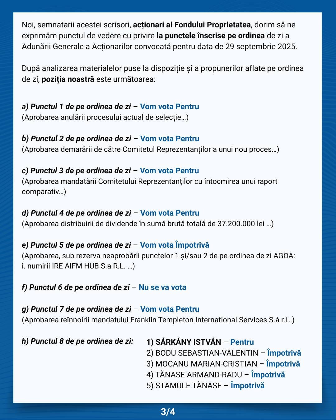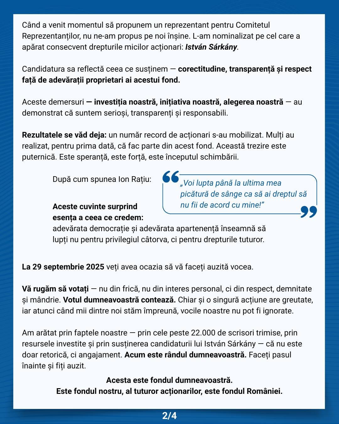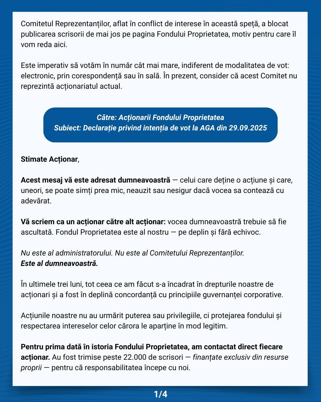 Zilele acestea are loc votul pentru AGA din 29 septembrie a Fondului Proprietatea. Eu am votat deja prin eVote, pentru orice eventualitate, dar intenționez să fiu prezent și în sală. Cei propuși pentru administrare promit multe, însă, de-a lungul timpului, au demonstrat că sunt doar foarte buni la făcut promisiuni, nu și la respectarea lor. În același timp, am fost atacați pe motiv că am genera incertitudine. Cu alte cuvinte, deranjăm jocurile politice. Pentru a răspunde celui mai recent atac la adresa strategiei noastre: nu, Fondul nu va rămâne fără supraveghere. Dacă demitem Comitetul Reprezentanților, va exista un interimat până la următoarea AGA. Redau mai jos și scrisoarea deschisă pe care Comitetul a refuzat să o publice.