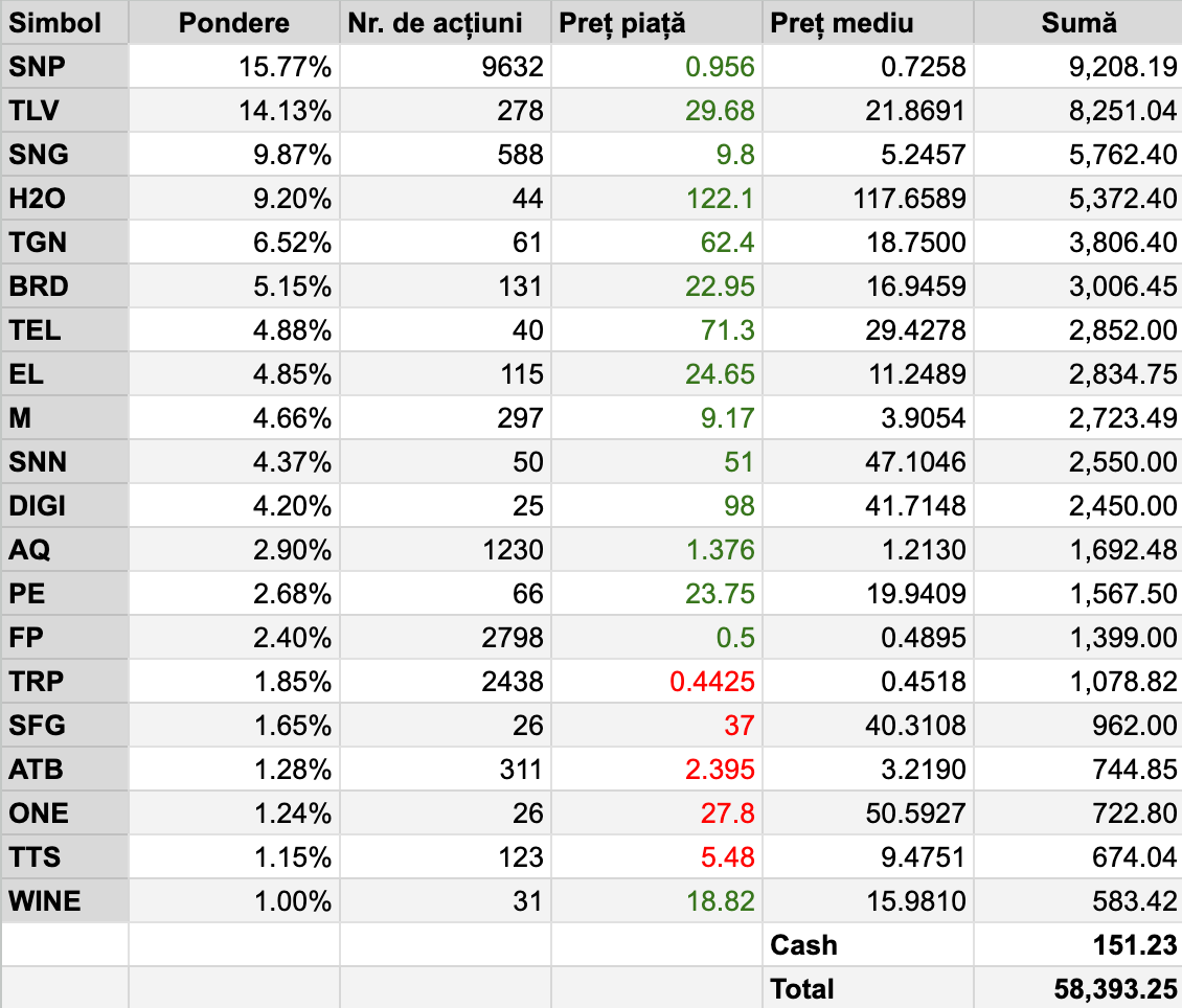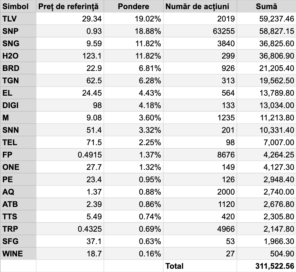 WINE – venituri în creștere cu 15%, profit net în scădere cu 17%. O mare parte din scăderea profitabilității este cauzată de deprecierea valutelor principale folosite de ei în raport cu euro. Odată cu intrarea Maspex în acționariat, mă aștept să se deschidă noi piețe și, pe termen mediu și lung, compania să aibă performanțe foarte bune. Problema pe care o văd pentru portofoliul fetelor este că sunt șanse mari să părăsească indicele BET în favoarea celor de la Cris-Tim, dar vom face rebalansarea în momentul când va fi necesar.